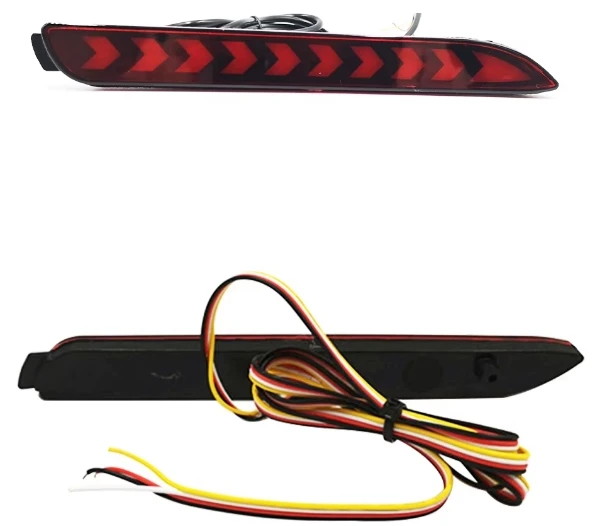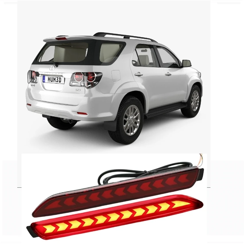Luces LED de estilo óptico 3D modernas y perfectas con señal de giro fluidas, que mejoran la apariencia general del vehículo y al mismo tiempo sirven como un logotipo de seguridad reflectante trasero. Este par de luces LED para parachoques trasero reemplazará perfectamente la lente tragaluz reflectante original de su Toyota Fortuner, brindando a su camioneta una iluminación suave y uniforme, hermosas curvas de flujo, ajuste preciso y reemplazo directo. Equipado con modelos de luz trasera/de freno, mejora la seguridad en la calle.